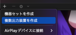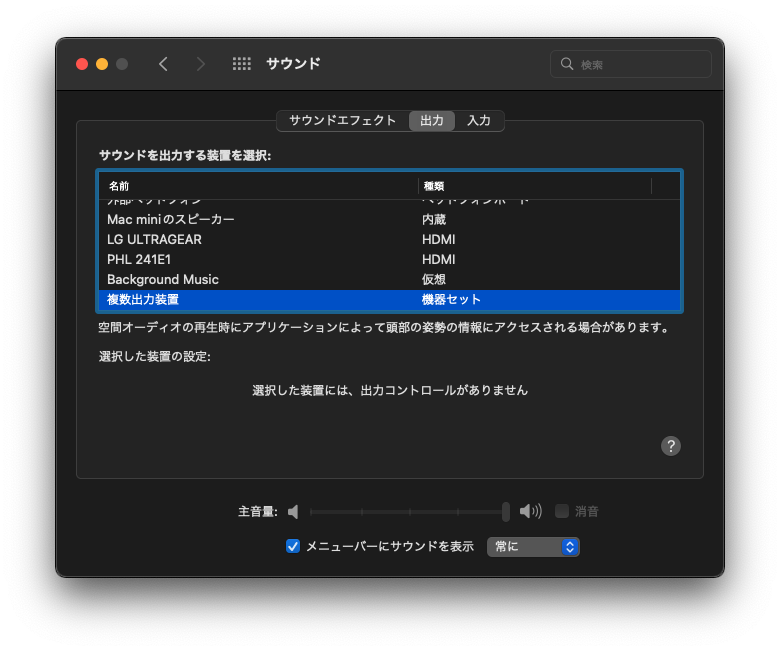 その後、システム環境設定の「サウンド」から、出力に先ほど作成した複数出力装置を指定します