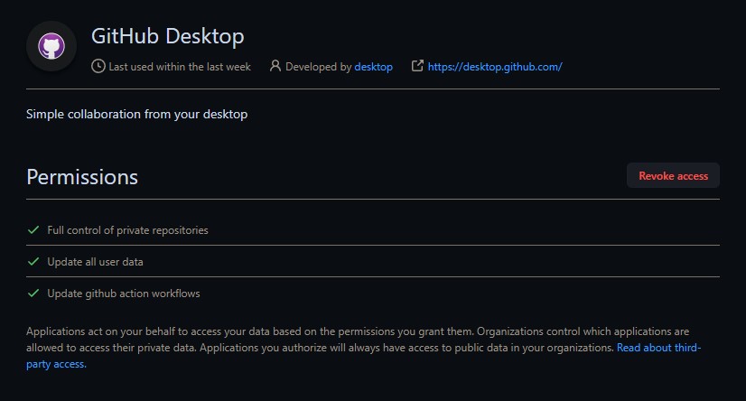 GitHub Desktopの権限の欄を見ると、“Update github action workflows"が存在します