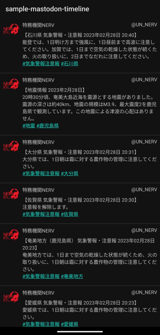 人様の投稿内容を載せるのも気がひけるので、今回はNERV鯖のタイムラインを取得してみました(情報の拡散目的で転載している訳では無いので目を瞑って頂けると・・・)