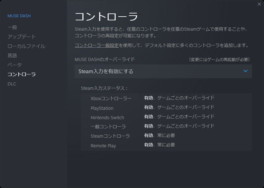 ライブラリ(MuseDash)の歯車ボタン > プロパティ > コントローラ で
