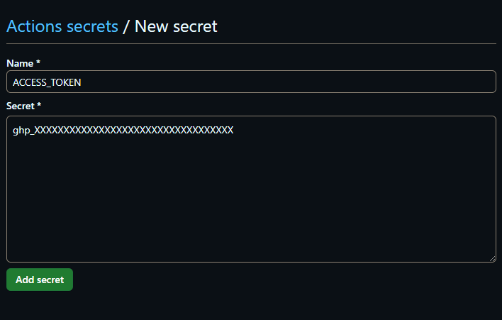 secrets.ACCESS_TOKENはリポジトリの操作の際に必要ですが、値は後ほど定義します