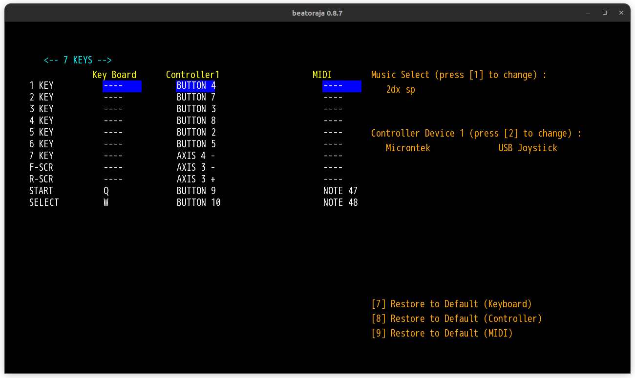 またbeatorajaの設定も一応チェックしてください(起動ボタンを押してから出てきた選曲画面でキーボードの6を押す)