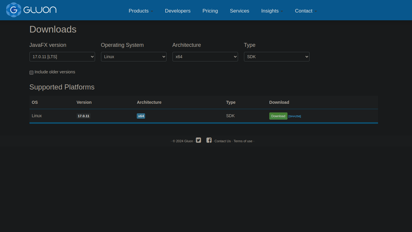 ここ のDownloadsから各オプションを選択してJavaFXを引っ張ってくる