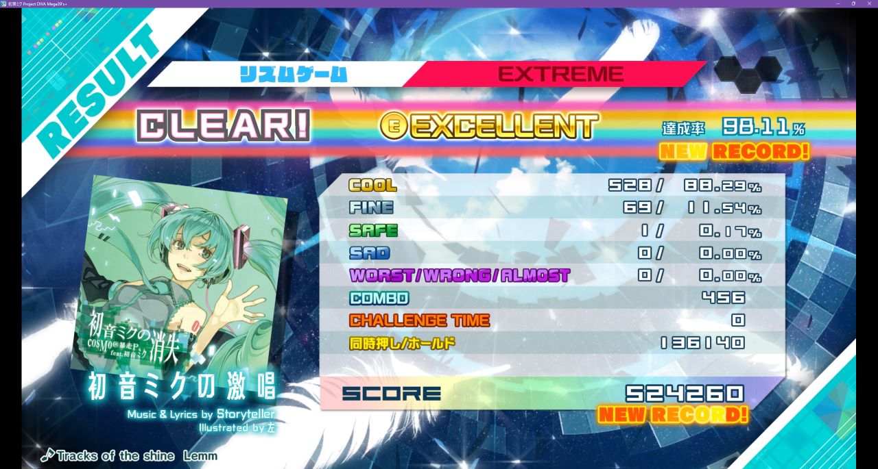 クリアを通り越してここまで詰めました。ちなみにSAFE判定はコンボ継続しないので、ギリギリフルコンは出来ていません。そこだけは若干心残り。そもそもPSP版とアーケード(PC)版は譜面が違うので比較しても仕方ないという所はあるけど。
