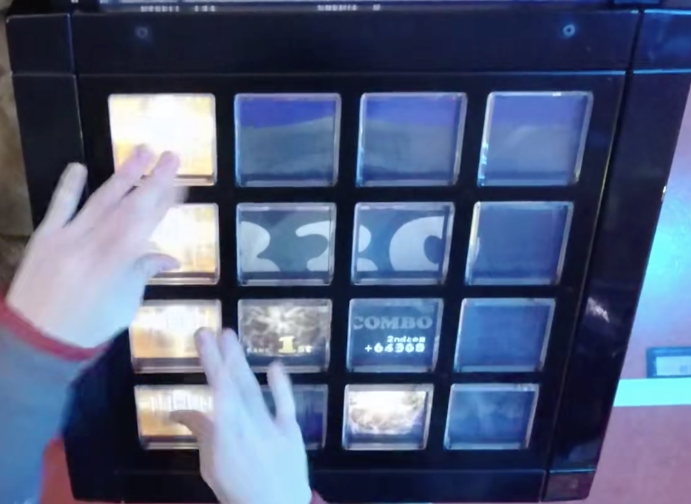 音符を形どった同時押し。左手で左下4つを取り、上半分の4つは全て右手で取る。慣れないと少し難しい。この配置が、後に譜面にも実装されることになる。